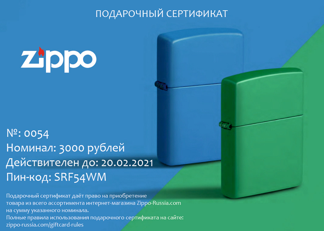 Подарочный сертификат Zippo 10000 от официального дилера Zippo в Нижнем Новгороде. Вы можете дополнительно заказать гравировку, которая подчеркнет Вашу оригинальность и придаст памятность статусному подарку.